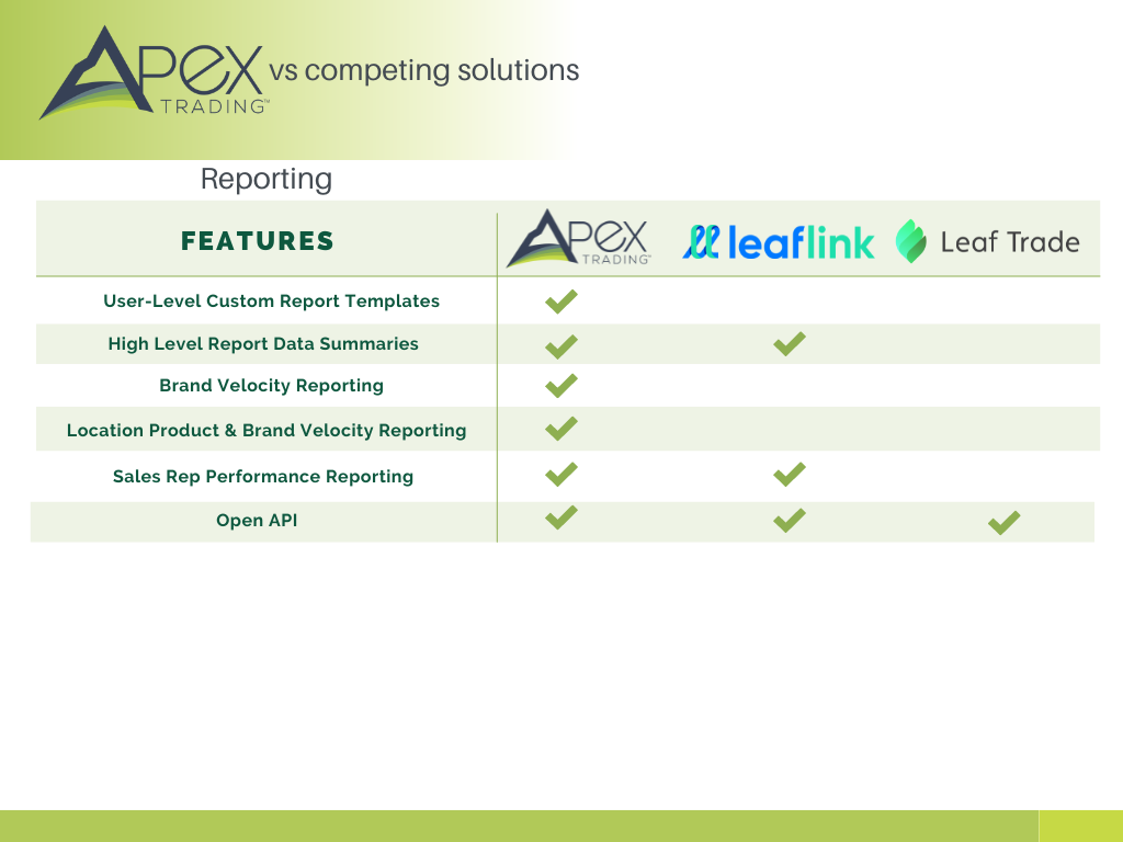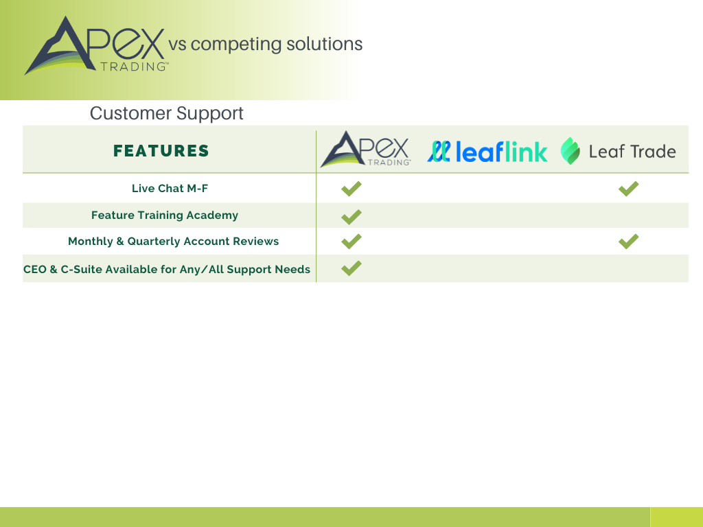 That pretty much sums it up, but to add a bit to it, the entire team at Apex Trading prides itself on delivering the best, most responsive customer service in cannabis. We feel giving you the support you need to use our cutting-edge tools is paramount in holding up our end of the bargain.