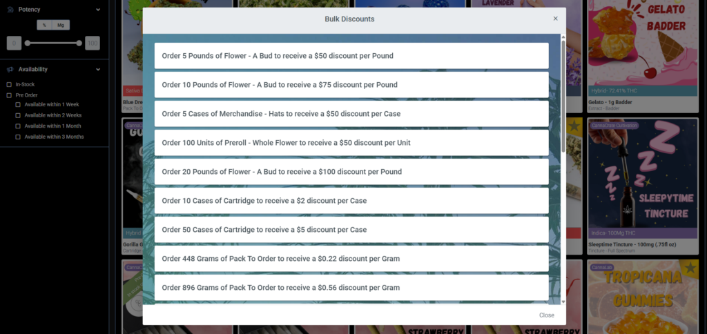 Wholesale cannabis purchasing often requires quite a bit of communication between buyers and sellers to ensure everyone is getting what they want out of the deal. This communication allows you to work with a seller on pricing based on a number of factors to get you the best possible price. We’ve built in the instant messaging, sendable custom-tailored menus and more to allow for relationships to develop and prices to be negotiated. What’s more, our Customer Success Team is there to help you make connections, if you can’t find what you’re after via the standard features.