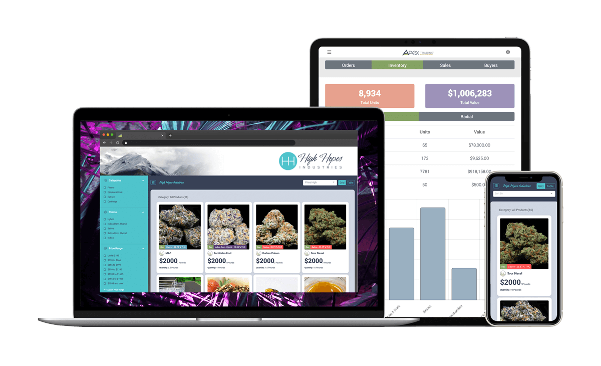 Using our Slack integration, Quickbooks integration, METRC integration as well as the live/shoppable menus, inventory, order and sales management tools, wholesale cannabis businesses across the country are streamlining their companies, creating efficiencies throughout their organizations, and saving money across the board. To learn more about how Apex Trading can help your cannabis business, please request a demo below.